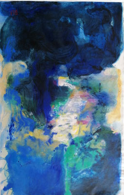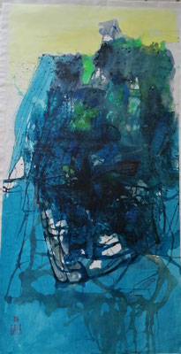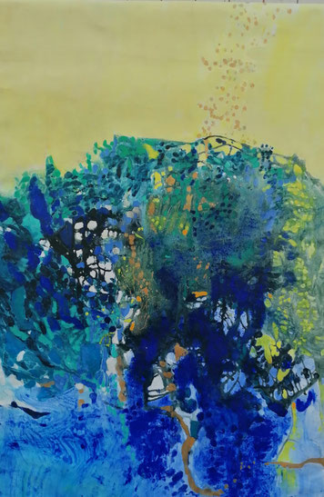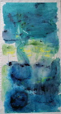J’ai travaillé dans un dialogue intuitif entre les propriétés du matériau, les couleurs, l’eau, le papier et mes souvenirs, comme une banque d’images dans ma tête.